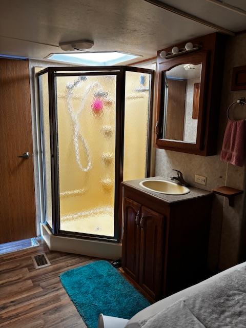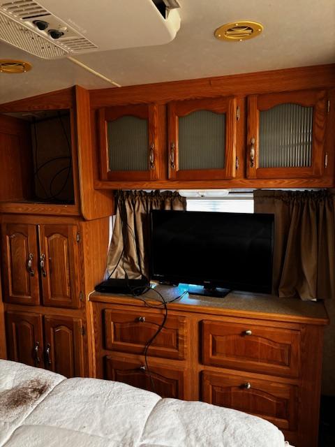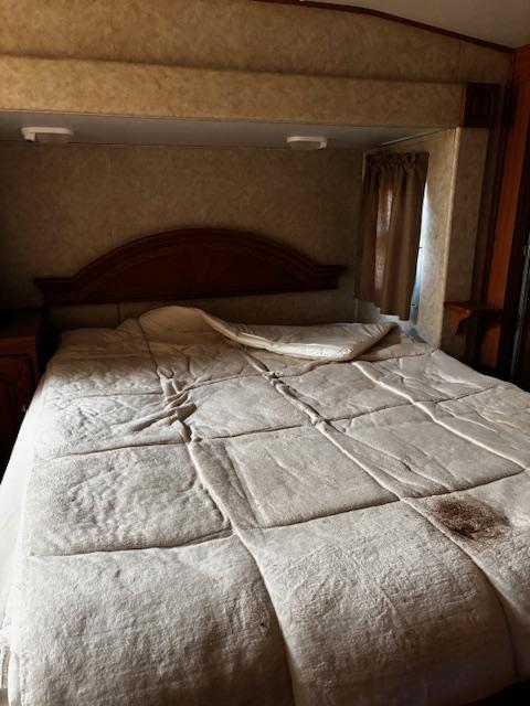 WITH A LITTLE TLC, YOU CAN MAKE THIS YOURS. 2 BEDROOMS WITH 1-1/2 BATH. 3 SLIDES, FRONT AND REAR ELECTRIC STABILIZERS, OUTSIDE SHOWER, LADDER, BIKE RACK, MANUAL AWNING, SPARE TIRE, FRONT PASS THRU STORAGE. ONAN 3600LP GENERATOR, 2 A/C’S. INSIDE HAS NEW FLOORING AND NEW CEILINGS IN LIVING ROOM. KITCHEN HAS MICROWAVE, DOUBLE SINK, GAS/ELECTRIC REFRIGERATOR, 3-BURNER STOVE WITH OVEN. MAIN BEDROOM IN FRONT, HAS FULL SIZE BED, DOUBLE DOOR MIRRORED CLOSET, LARGE DRESSER AREA, SHOWER, SINK WITH VANITY AND MIRROR, TOILET IN SEPERATE CLOSET. SPARE BEDROOM IN REAR HAS TWIN BED, DRESSER AND 1/2 BATH